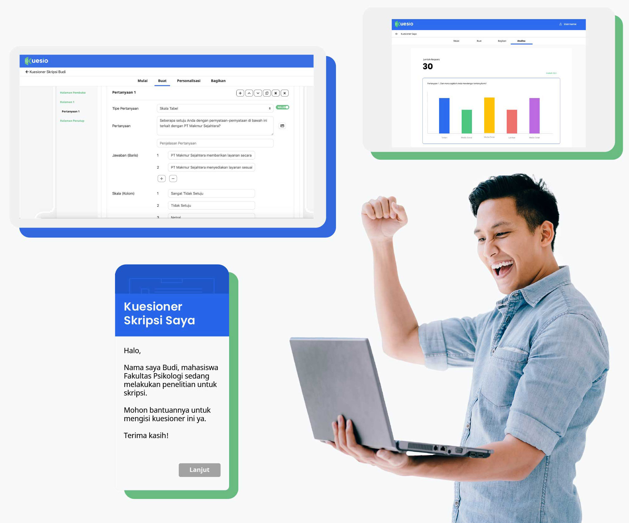 Mulai dari membuat kuesioner online sampai dengan mengolah datanya, Kuesio akan membantu menjadikan setiap prosesnya menjadi lebih cepat.